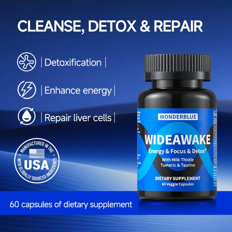 Wonderblue Wideawake Milk Thistle Tumeric & Taurine Capsules for Vitality Energy Detox 60 Veggie Capsules USA Made FDA GMP Supplement